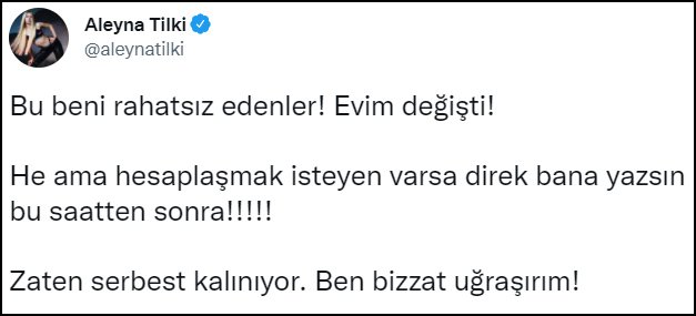 Genç şarkıcı, haberi ise sosyal medyadan duyurdu: "Bu beni rahatsız edenler! Evim değişti! He ama hesaplaşmak isteyen varsa direkt bana yazsın bu saatten sonra! Zaten serbest kalınıyor. Ben bizzat uğraşırım!"