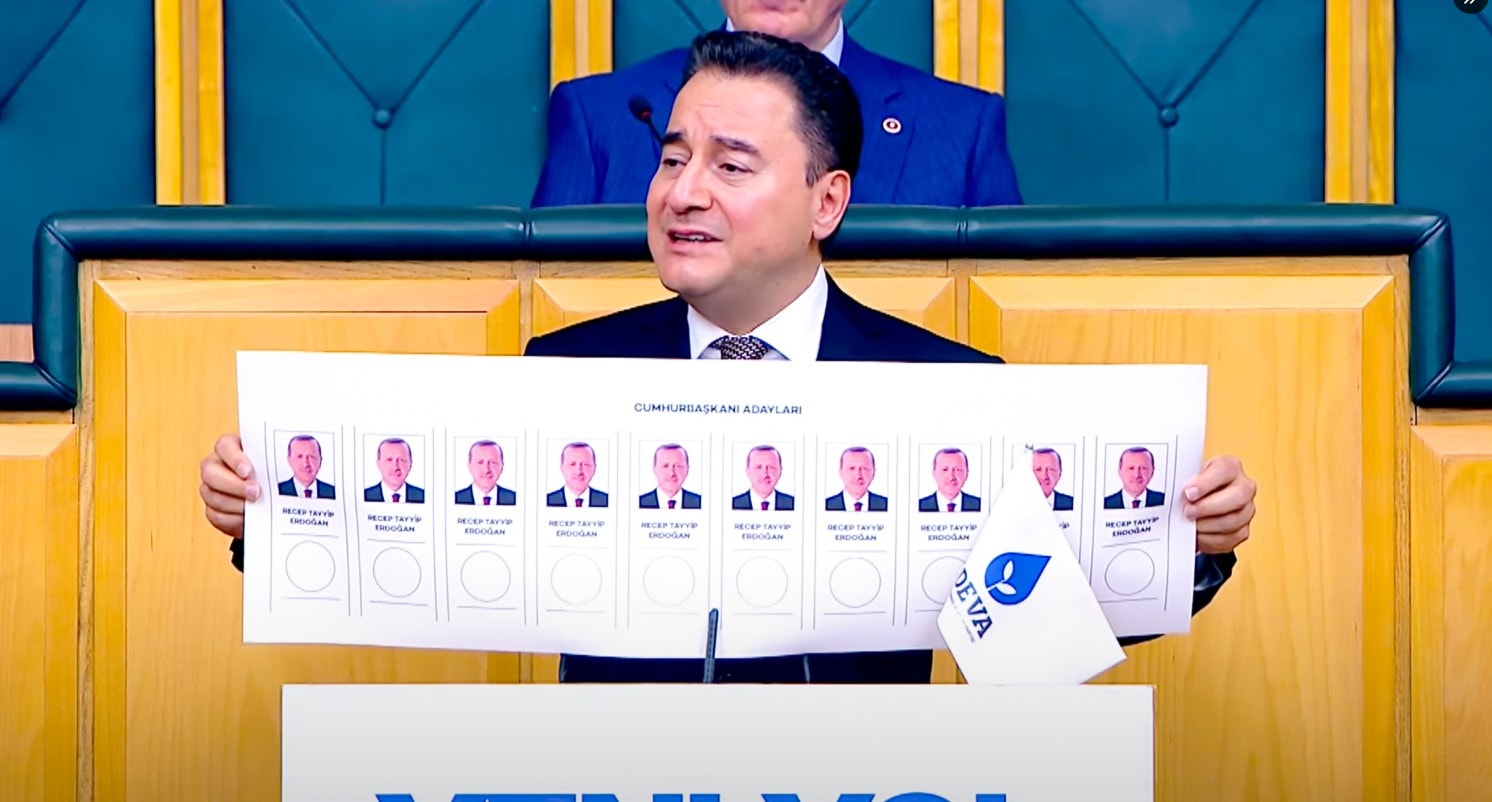 Babacan, “DEVA Partili gençlerin buradaki grup toplantısına hediyesidir” diyerek üzerinde sadece Cumhurbaşkanı ve AKP Genel Başkanı Recep Tayyip Erdoğan’ın fotoğraflarının bulunduğu bir oy pusulasını kürsüden gösterdi.