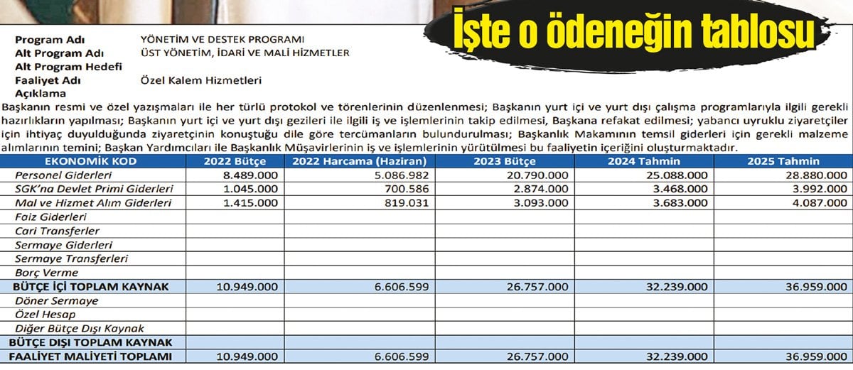 Bu hizmetler Erbaş’ın her türlü resmi ve özel yazışmaları, her türlü protokol ve törenlerinin düzenlenmesi; Başkanın yurt içi ve yurt dışı çalışma programlarıyla ilgili gerekli hazırlıkların yapılması; Başkanın yurt içi ve yurt dışı gezileri ile ilgili iş ve işlemlerinin takip edilmesi, Başkana refakat edilmesi, yabancı uyruklu ziyaretçiler için ihtiyaç duyulduğunda tercümanların bulundurulması; Başkanlık makamının temsil giderleri için gerekli malzeme alımlarının temini gibi çalışmaları kapsıyor. Diyanet’in 2022 yılı özel kalem bütçesi ise 10 milyon 949 bin lira olmuştu.