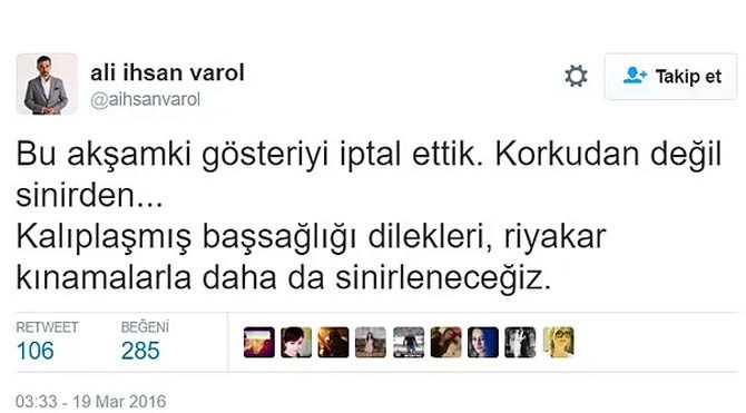 Kelime Oyunu adlı yarışma ile tanınann başarılı oyuncu Ali İhsan Varol, tek kişilik oyunu ‘Etimolojik Cahil Cesareti’ni Taksim'de meydana gelen patlama nedeniyle iptal etti. 4 kişinin hayatını kaybettiği, 2'si ağır 36 kişinin yaralandığı korkunç saldırı sonrası programını iptal eden Ali ihsan Varol, sosyal medya hesabından, "Bu akşamki gösteriyi iptal ettik. Korkudan değil sinirden... Kalıplaşmış başsağlığı dilekleri, riyakar kınamalarla daha da sinirleneceğiz..." notunu paylaştı.