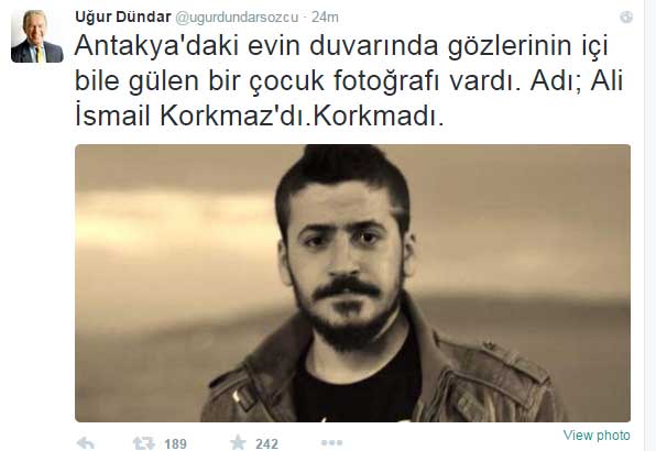 Sözcü Gazetesi Yazarı Uğur Dündar da Ali İsmail için bir anma mesajı yayımladı. Dündar'ın mesajı şöyle: