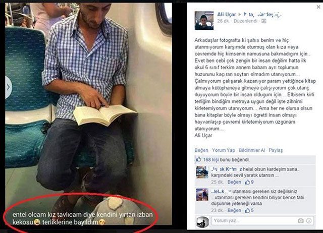 Facebook'ta, İZBAN'da yolculuk yaparken, elinde kitap ve ayağında terlikleriyle kitap okurken çekilen fotoğrafı paylaşılan İzmirli Ali Uçar, bir anda fenomen haline geldi. Fotoğrafı paylaşan kişi, bir fabrikada işçi olarak çalışan Ali Uçar'ın entel görünmek için kitap okuduğunu ileri sürüp paylaştığı fotoğrafın altında, "Entel olcam, kız tavlıcam diye kendini yırtan İZBAN kekosu, terliklerine bayıldım" notunu yazdı. Ancak, bu andan itibaren, medikal malzemeler üreten bir fabrikada çalışan Ali Uçar'a, özellikle sosyal medya üzerinden büyük destek geldi. Uçar, son olarak konuk olduğu Beyaz Show adlı televizyon programında, kendisiyle ilgili aşağılayıcı paylaşımda bulunan kişi hakkında şikayetçi olmayacağını açıkladı.
