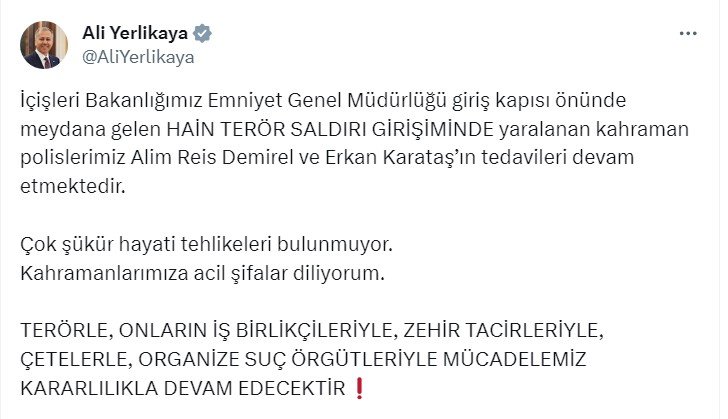 "İçişleri Bakanlığımız Emniyet Genel Müdürlüğü giriş kapısı önünde meydana gelen HAİN TERÖR SALDIRI GİRİŞİMİNDE yaralanan kahraman polislerimiz Alim Reis Demirel ve Erkan Karataş’ın tedavileri devam etmektedir. Çok şükür hayati tehlikeleri bulunmuyor. Kahramanlarımıza acil şifalar diliyorum. TERÖRLE, ONLARIN İŞ BİRLİKÇİLERİYLE, ZEHİR TACİRLERİYLE, ÇETELERLE, ORGANİZE SUÇ ÖRGÜTLERİYLE MÜCADELEMİZ KARARLILIKLA DEVAM EDECEKTİR!"