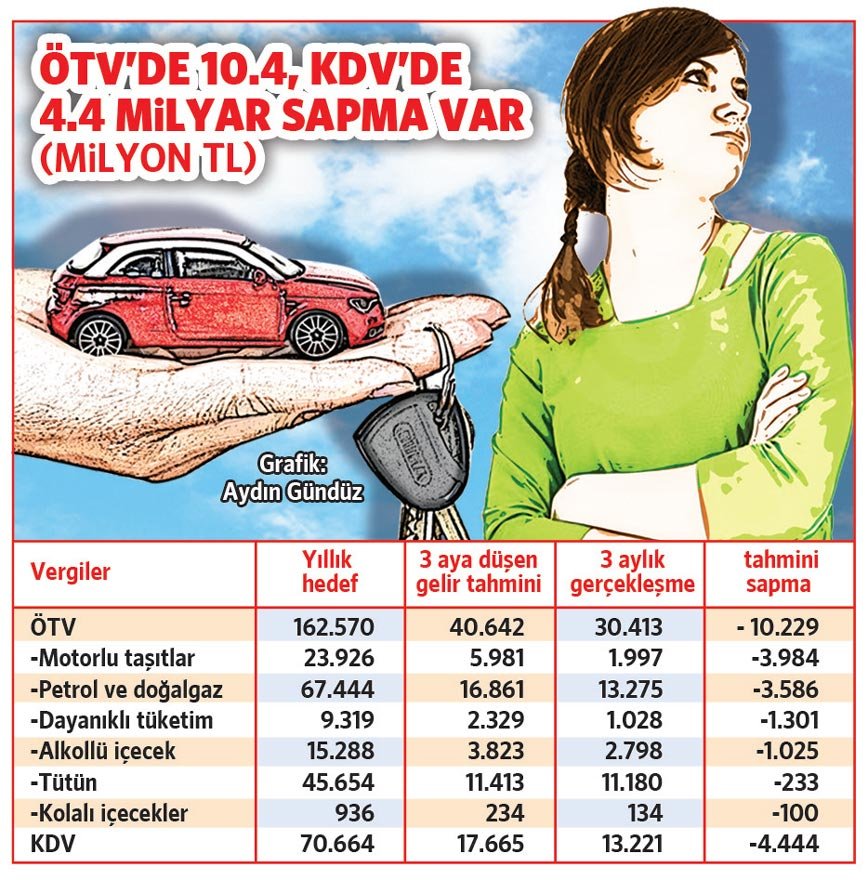 ÖTV’nin alt kalemleri içinde en büyük hedef sapması sıfır taşıtlara uygulanan vergide yaşandı. Ekonomi yönetimi, sıfır taşıtların satışından bu yılın tamamında 23.9 milyar lira ÖTV geliri elde edeceğini hesaplamasına karşın ilk 3 ayda kasaya sadece 1 milyar 997 milyon lira girdi. Oysa yıllık hedefe uyumlu olarak 3 ayda yaklaşık 5 milyar 981 milyon lira civarında bir gelir elde edilmesi gerekiyordu. Geçen yılın ilk 3 ayında elde edilen 4.6 milyar liraya bile ulaşılamayınca şimdiden 4 milyar liraya yakın sapma oluştu. Hedefe uyumlu 3 aylık performans petrol ve doğalgaz ÖTV’sinde 3.6 milyar, dayanıklı tüketim mallarında 1.3 milyar, alkollü içeceklerde 1 milyar, tütünde 233 milyon ve kolalı içeceklerde 100 milyon lira civarında sapmayı işaret ediyor.  KDV gelirinde de yılın ilk 3 ayında 70.6 milyar liralık yıllık hedefin sadece 13.2 milyar lirasına ulaşılabildi. Oysa 17.6 milyar lira kaynak girişi bekleniyordu.