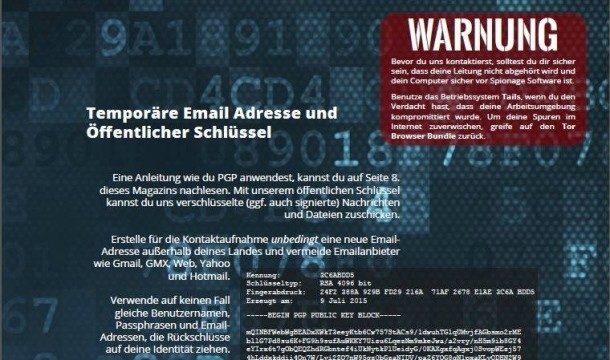 Habere göre, ilk sayısının kapağında flaş bellek ve mermi fotoğrafını kullanan dergi, "Biz meta veri temelinde öldürüyoruz", "Verileri gizli servisler ve askeri birimlere karşı güvenle saklama", "Gizli servislerin korkulu rüyası ol", "WhatsApp ve Telegram´a alternatifler" gibi başlıkları ön plana çıkartıyor.