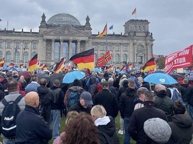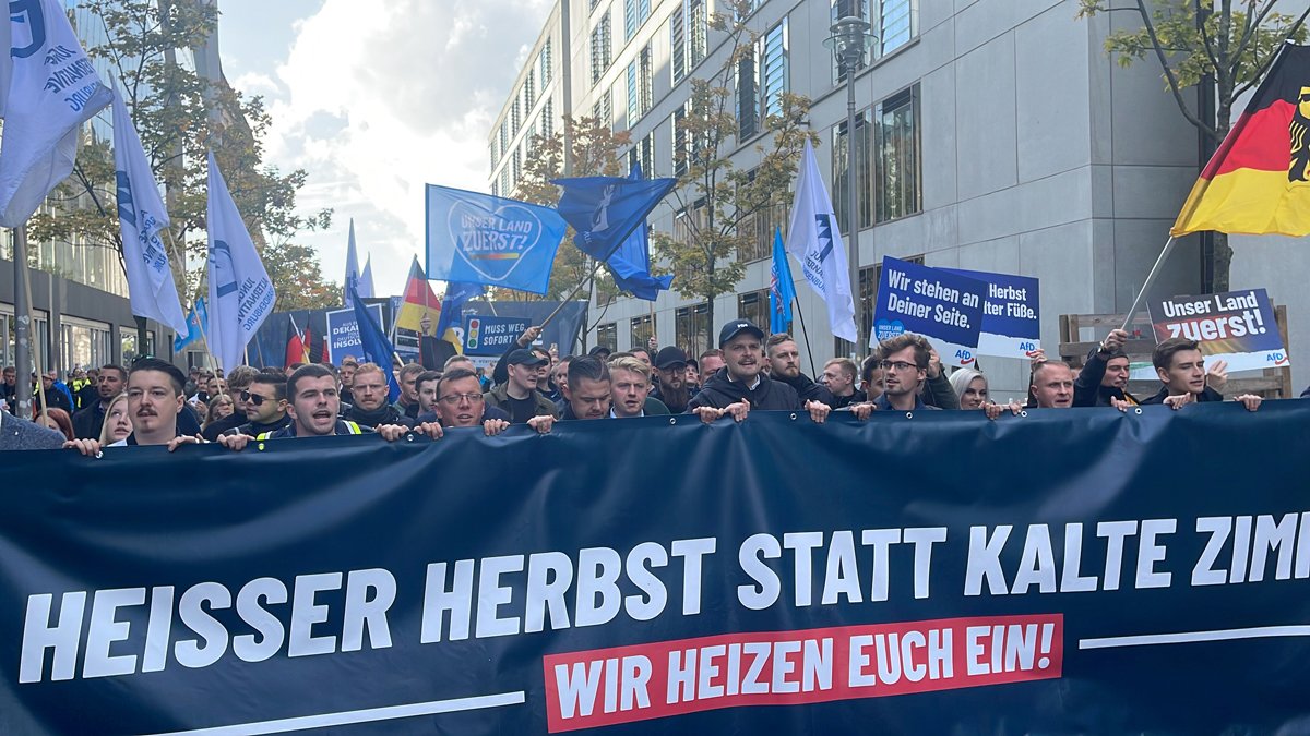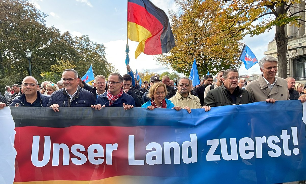 Almanya’da İslam ve göçmen karşıtı Almanya için Alternatif Partisi (AfD), başkent Berlin’de hükümetin enerji politikasını protesto etti. Gösteriye AfD Eş Başkanı Tino Chrupalla (sol 3) ve bazı AfD’li milletvekilleri de katıldı. FOTO: AARUSYA BAYRAKLARI DA TAŞINDI