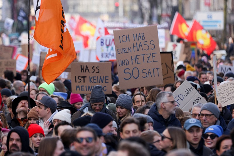 Eylemciler, "Bir daha asla, şimdi" ve "AfD alternatif değildir" yazan döviz ve pankartlar açtı. Yaklaşık 100 bin kişi, ülkedeki ırkçılığı ve aşırı sağı protesto etti.