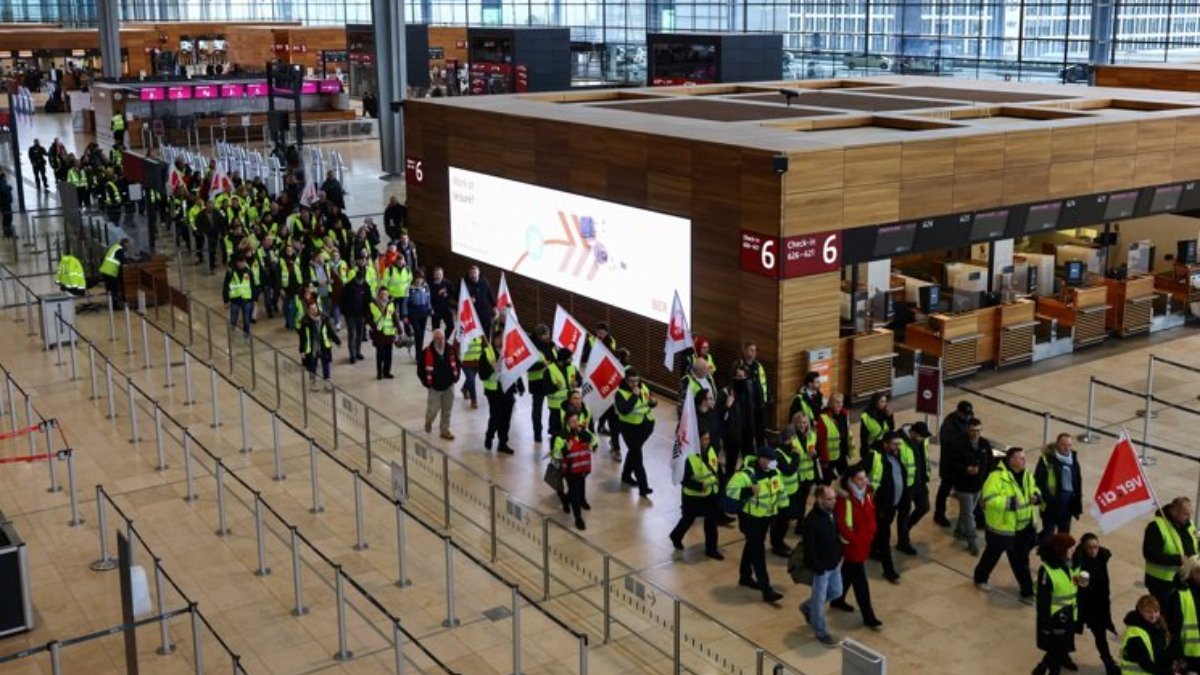 Berlin-Brandenburg Havalimanı'nda çalışan güvenlik personeli, hafta sonu ve tatil günlerinde ödenen ek ücretlere artış yapılması talebiyle Verdi Sendikasının çağrısıyla bir günlük iş bırakma eyleminde bulundu. Uyarı grevi sebebiyle Berlin-Brandenburg Havalimanı’nda yaklaşık 270 uçuş iptal edilirken, çalışanlar havalimanı önündeki Willy-Brandt Meydanı'nda toplanarak gösteri yaptı.