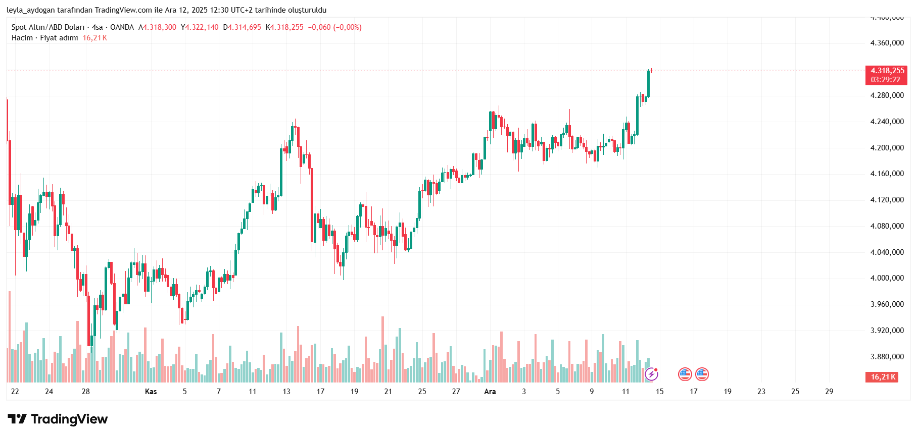 Türkiye saatiyle çarşamba gecesi Amerika Merkez Bankası'nın (Fed) 25 baz puanlık faiz indirimiyle politika faizini yüzde 3,5-3,75 aralığına çekmesi de altın fiyatlarının yükselmesine neden oldu.