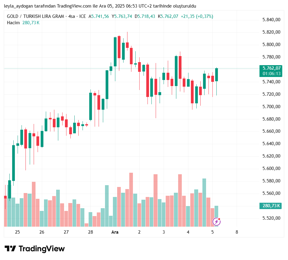 Ons altındaki yatay görünüm iç piyasaya sınırlı bir artış olarak yansıdı. Gram altın, güne yüzde 0,1’lik yükselişle başlayarak 5 bin 762 lira seviyesinde işlem görüyor. Kapalı Çarşı'da ise gram altın 5 bin 877, çeyrek altın 9 bin 580 liradan işlem görüyor.