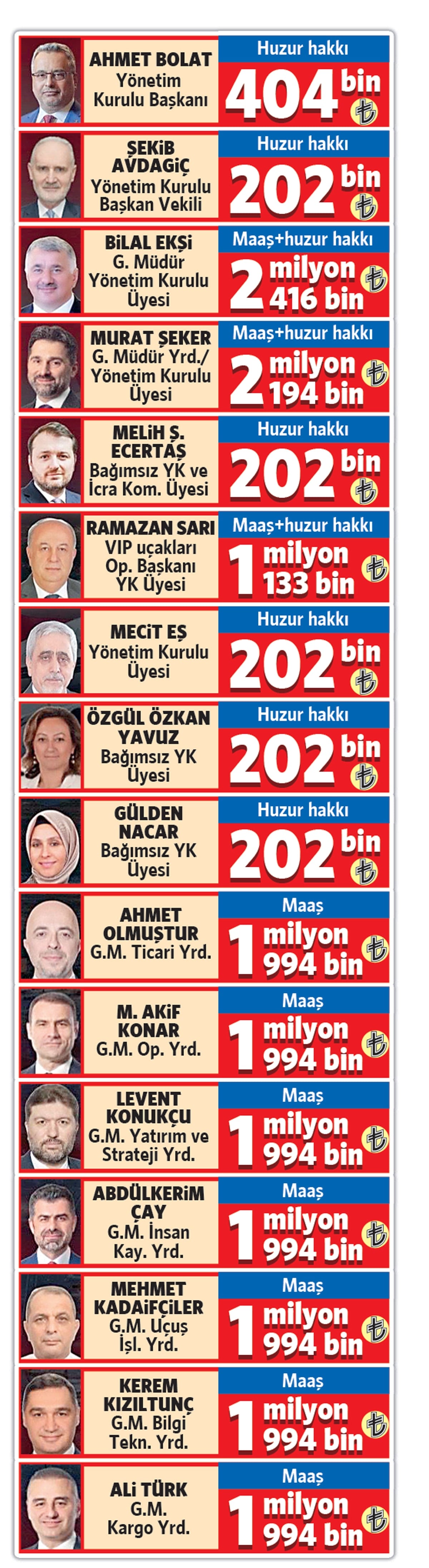 THY Genel Müdürü Bilal Ekşi maaş ve huzur hakkı olarak ayda 2 milyon 416 bin lira alıyor. THY’deki 8 genel müdür yardımcısından 7’sine her ay 1 milyon 994’er bin lira ücret ödeniyor. Genel Müdür Yardımcısı Murat Şeker ise 2 milyon 194 bin lira aylık ücret alıyor.