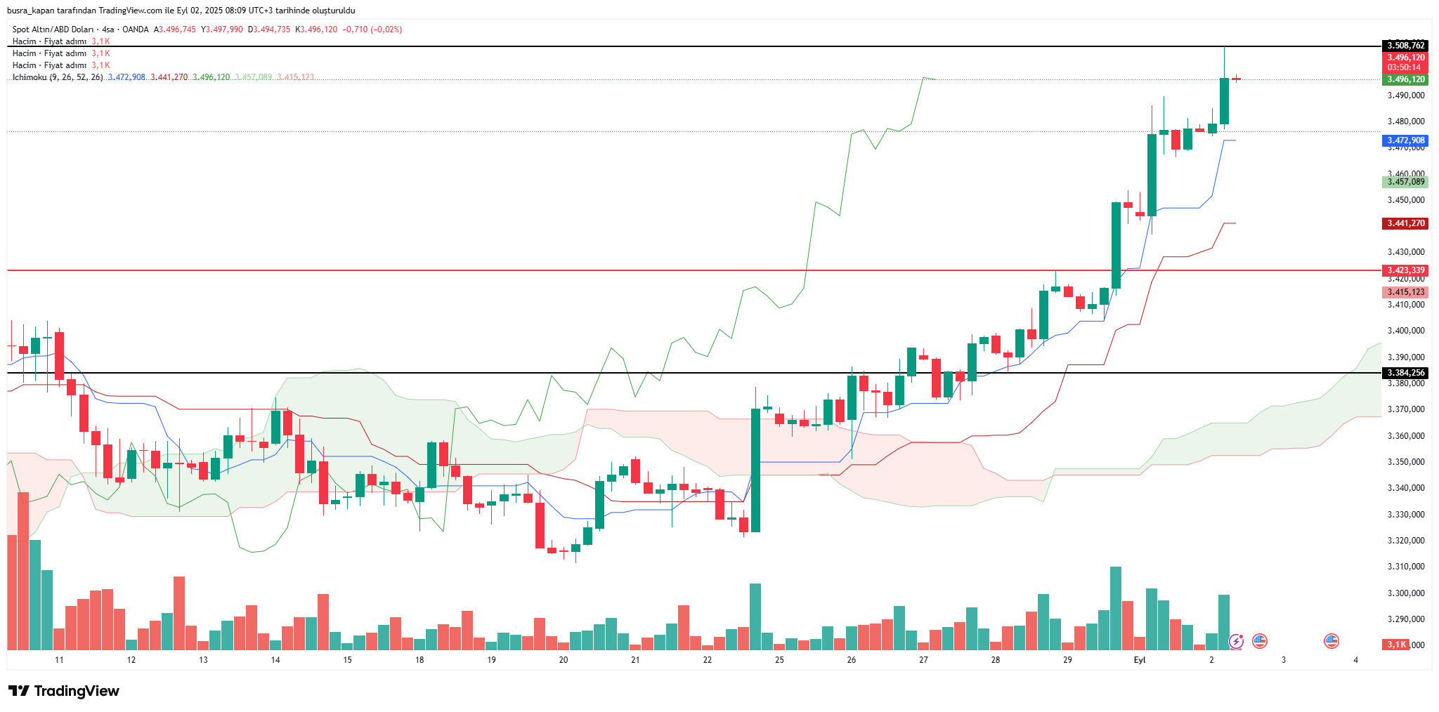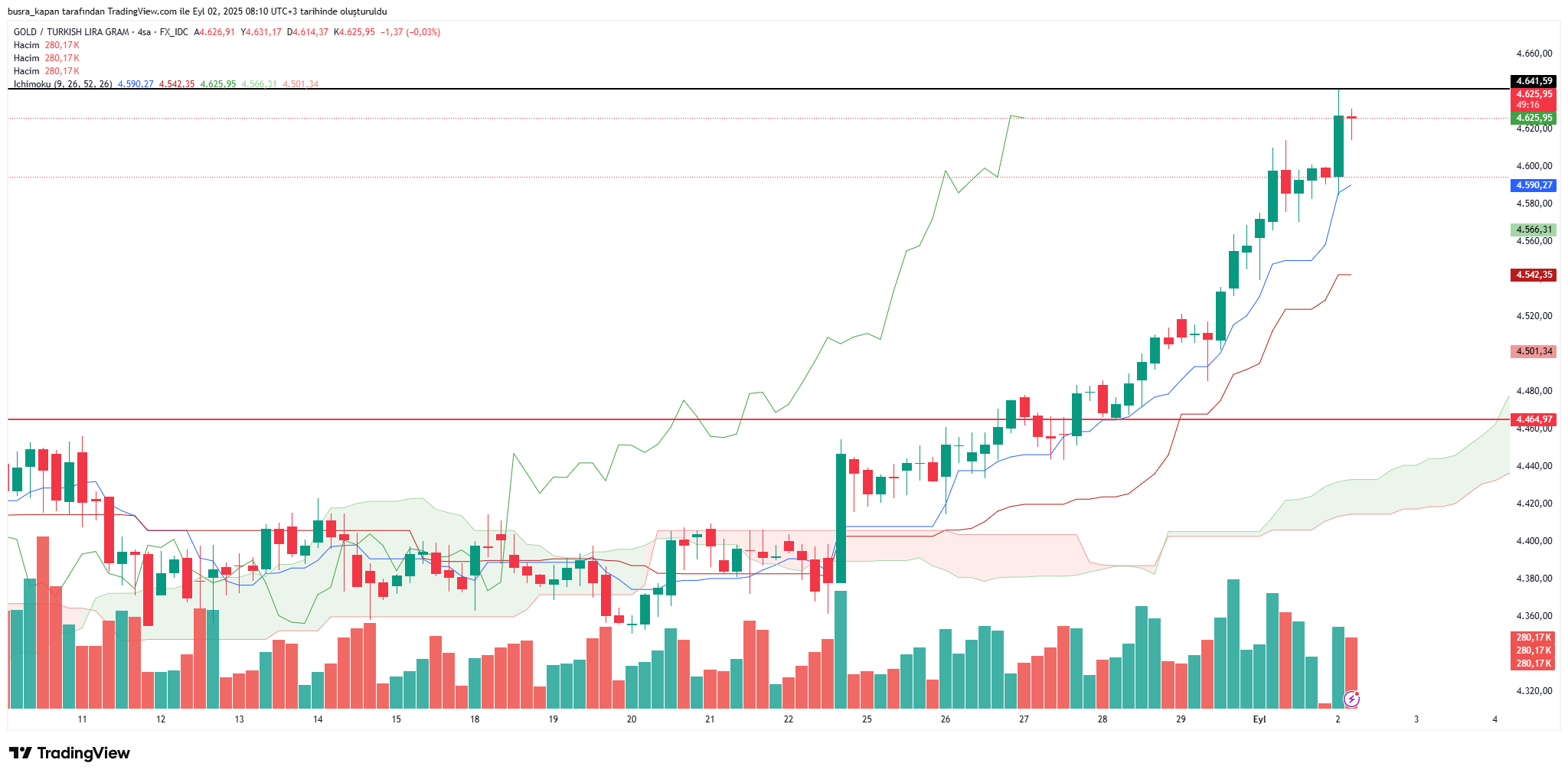 Ons altının 4 saatlik grafiği incelendiğinde alımların güçlü şekilde devam ettiği görülürken, İchimoko'nun ise yükselişlerin devam edebileceği sinyalini veriyor.