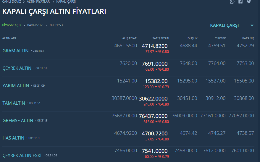 Resmi altın fiyatları ile Kapalıçarşı altın fiyatları arasındaki fark devam ediyor. Resmi rakamlarda gram altın 4 bin 672 lirada bulunurken, Kapalıçarşı'da 4 bin 715 lirada bulunuyor. İşte Kapalıçarşı altın fiyatları...