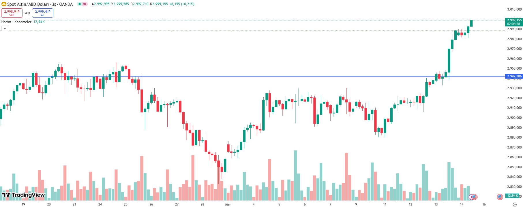 Ons altın 2025 yıl sonu hedefi olan 3 bin dolar seviyesine bugün ulaştı. An itibariyle 3003 dolar seviyesinden işlem görüyor.