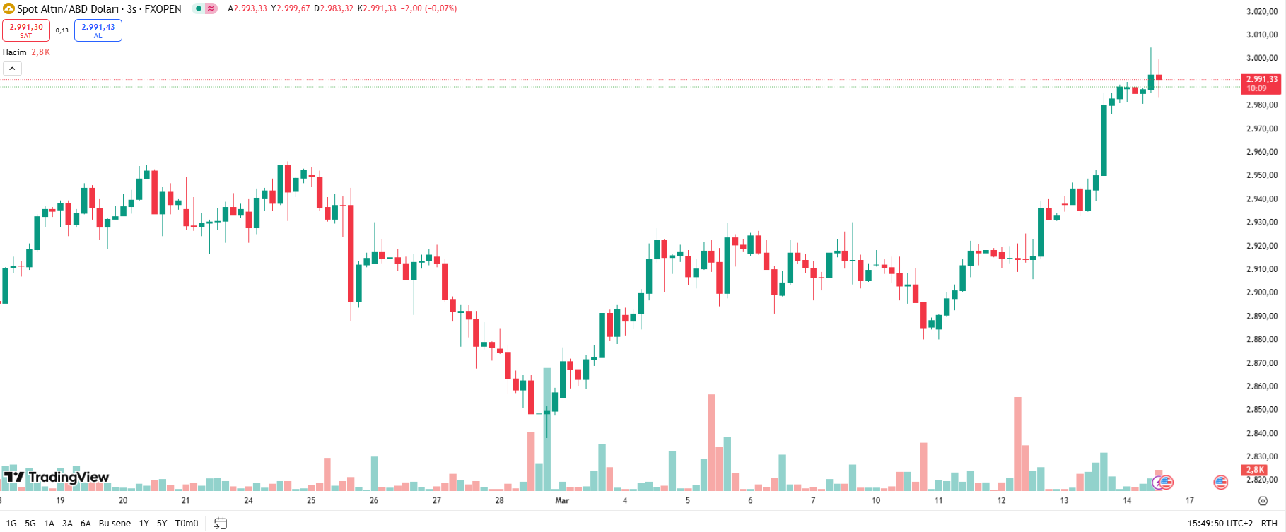 Saat 16.44 itibariyle ons altın fiyatı rekor seviyesi olan 3003 doların altına düşerek 2.993,75 dolar seviyesinden işlem görüyor.