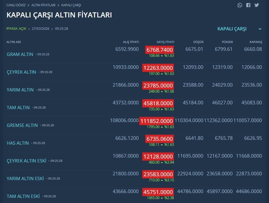 Kapalıçarşı altın fiyatları ile resmi altın fiyatları arasındaki fark devam ediyor. Kapalıçarşı'da gram altın 6 bin 768 liradan satılıyor. İşte Kapalıçarşı altın fiyatları...