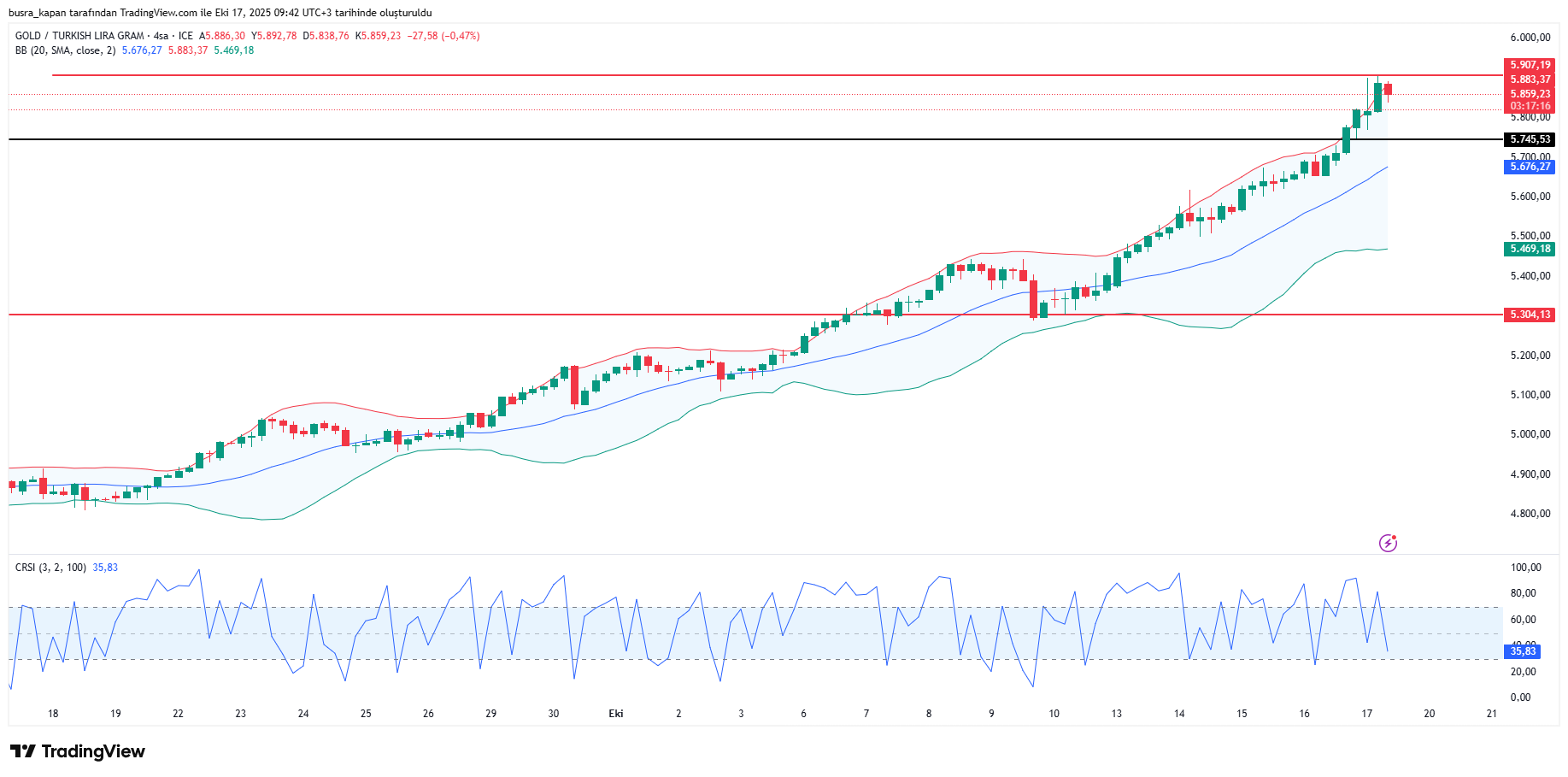 17 Ekim 2025 sabahı gram altın resmi rakamlarda, 5 bin 910 TL’ye çıkarak tüm zamanların en yüksek seviyesini gördü. Günün ilk saatlerinde 5 bin 855 TL civarında işlem gören gram altın, Kapalıçarşı’da 6 bin 267 liraya yükselerek tüm zamanların rekorunu gördü.