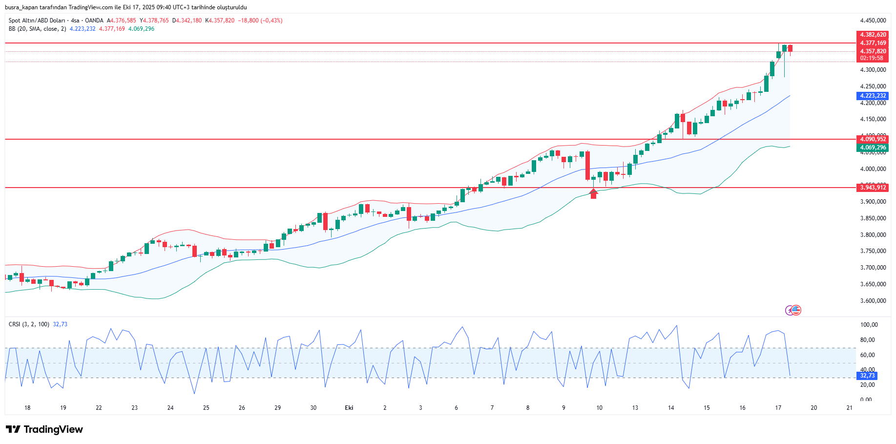 Siyasi ve jeopolitik riskler, merkez bankalarının devam eden alımları ile Fed'e yönelik faiz indirimi beklentileri altını desteklemeye devam ediyor. Altının onsu yeni işlem gününde 4 bin 379,42 doları görerek rekor tazeledi. Ons altın şu sıralarda önceki kapanışa göre yüzde 0,95 artışla 4 bin 366 dolardan işlem görüyor.