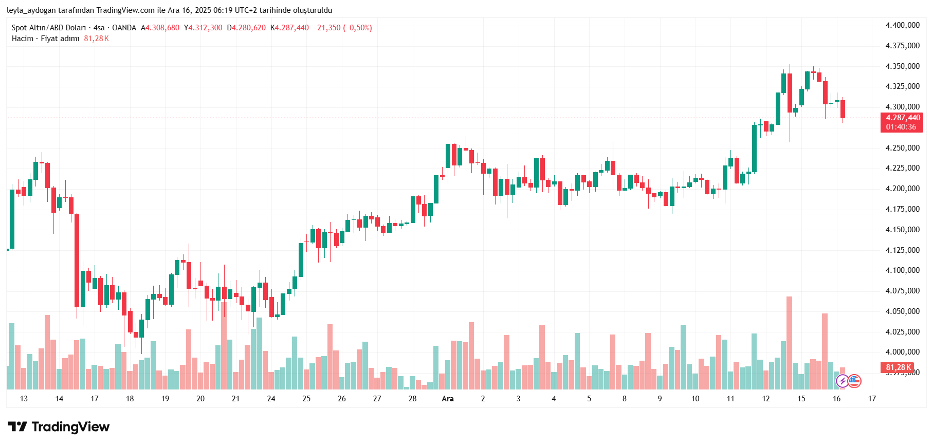 Spot altın, güne önceki kapanışa göre yüzde 0,4 gerileyerek 4 bin 288 dolardan işlem görürken, dün 4 bin 353 dolara kadar yükselmişti.