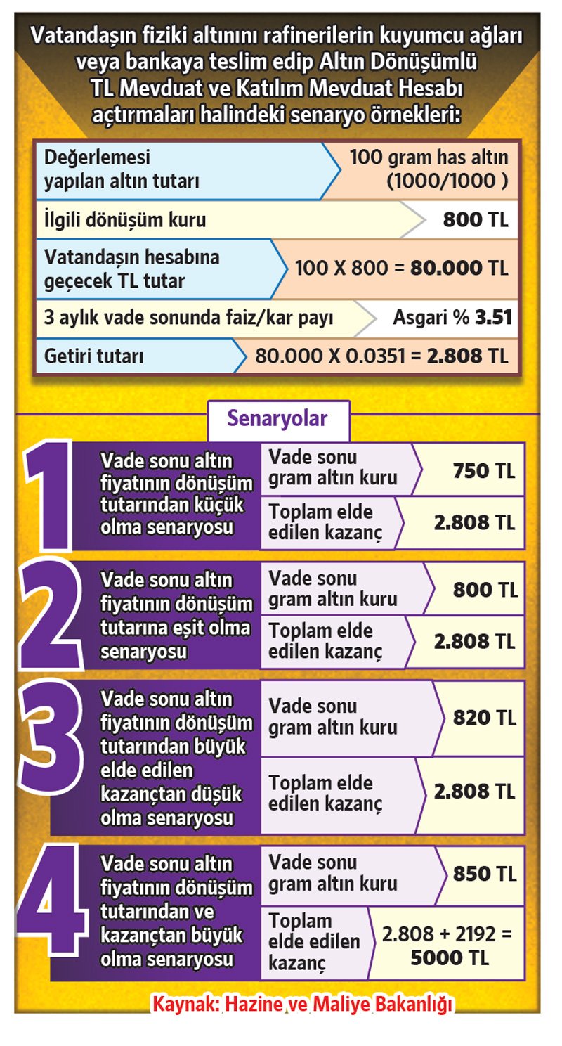 Vade sonunda altın fiyatının 800 TL’ye (dönüşüm tutarı) eşit veya daha düşük olması durumunda Hatice Teyze, 2 bin 808 TL’lik getiri ile yetinecek. Altın fiyat farkından getiri elde edebilmesi için toplam kazancın banka tarafından ödenecek faiz veya kâr payından yüksek çıkması gerekiyor. Örneğin altın fiyatı vade sonunda 850 TL’ye yükseldi ise Hatice Teyze 80 bin TL’lik tasarrufu ile 5 bin TL (2.808 TL+2.192 TL) getiri elde edebilecek.
