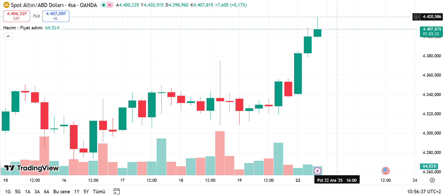 Spot altın, ABD Merkez Bankasının (Fed) geçen hafta yaptığı 25 baz puanlık faiz indiriminin ardından ilave faiz indirimlerine yönelik beklentilerin güçlenmesi, güvenli liman talebinin sürmesi ve doların zayıflaması ile pazartesi günü ons başına 4.396 doları gördükten sonra saat 11.45 itibariyle psikolojik sınır olan 4 bin dolardan 4 bin 428 dolara yükselerek tüm zamanların rekorunu kırdı.