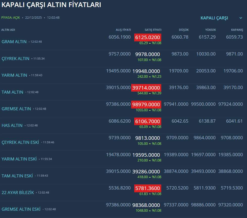 Yurt içinde gram altın serbest piyasada 6 bin 86 lirayı görürken Kapalıçarşı'da ise 6 bin 157 liraya kadar çıktı. Çeyrek altın Kapalıçarşı'da 10 bin 30 lira ile tarihinin en yüksek seviyesini gördü. Saat 11.45 itibarıyla 9 bin 978 lirada bulunuyor.