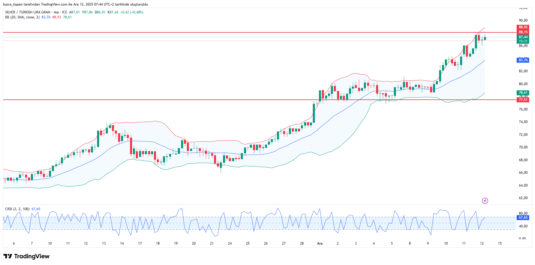 Gram gümüş, dolar/TL kurundaki yukarı yönlü seyir ve ons gümüşteki rekorların etkisiyle, peş peşe rekor tazeledi. Gram gümüş bugün 88,15 seviyesini yükseldi. Sabah seansında 08.44'te 87,44 lirada bulunuyor.