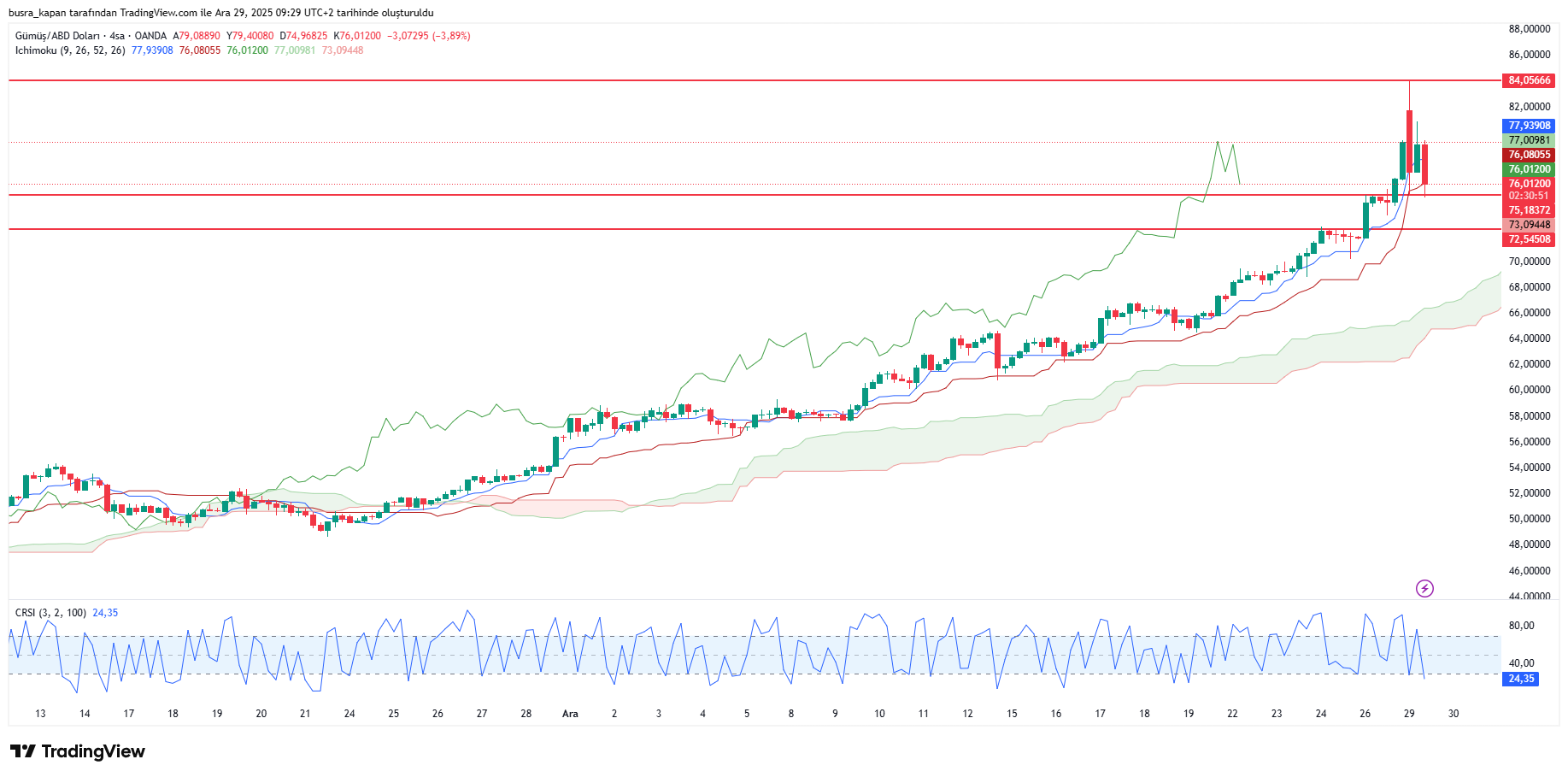 Rekor üstüne rekor kıran değerli metaller yeni haftanın ilk işlem gününde kazançlarının bir kısmını geri veriyor. Gümüş fiyatları haftaya düşüşle başladı. Ons gümüş sabah seansında 84,05 dolar seviyesine yükselerek tüm zamanların rekorunu kırdıktan sonra düşüşe geçti. Ons gümüş 08.08'de 79,32 dolar seviyesinde bulunuyor. Ons gümüş sabah seansından bu yana aşağı yönlü eğilim yaşayarak 10.27'da 75,96 dolar seviyesinde hareketleniyor.