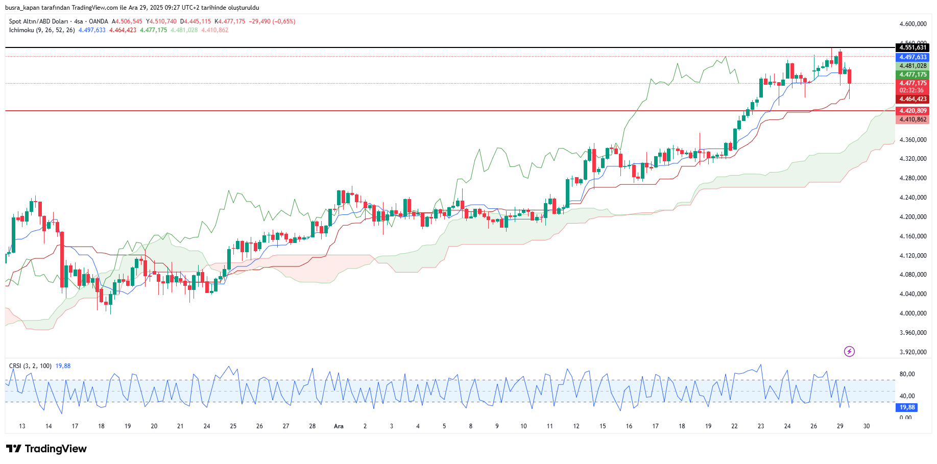 Ons altın, yüzde 0,4 düşüşle 4 bin 512 dolar seviyesinde yükseldi. Altın, cuma günü 4 bin 549 dolar ile tarihi zirvesini görmüştü. Ons altın bugün 10.27'de 4 bin 474 dolarda hareketleniyor.