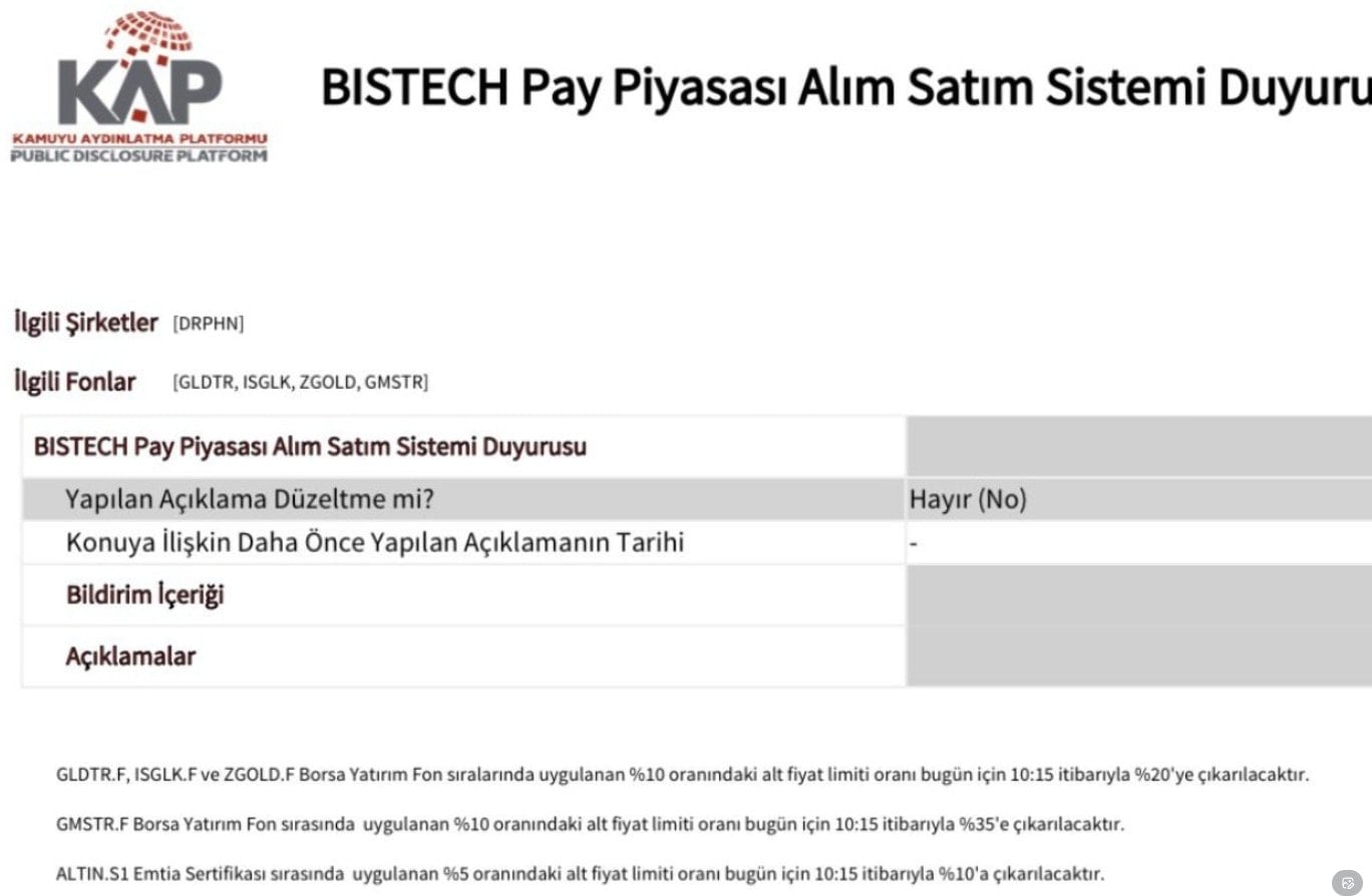 Yapılan düzenlemeyle birlikte değerli metallere dayalı yatırım araçlarında günlük fiyat hareketlerinin daha geniş bir bantta gerçekleşmesine olanak sağlandı. BİSTECH’in KAP açıklaması, altın ve gümüş fiyatlarında yaşanan sert düşüşlerin ardından, yatırımcıların daha yüksek günlük kayıplarla karşılaşabileceğine işaret etti.