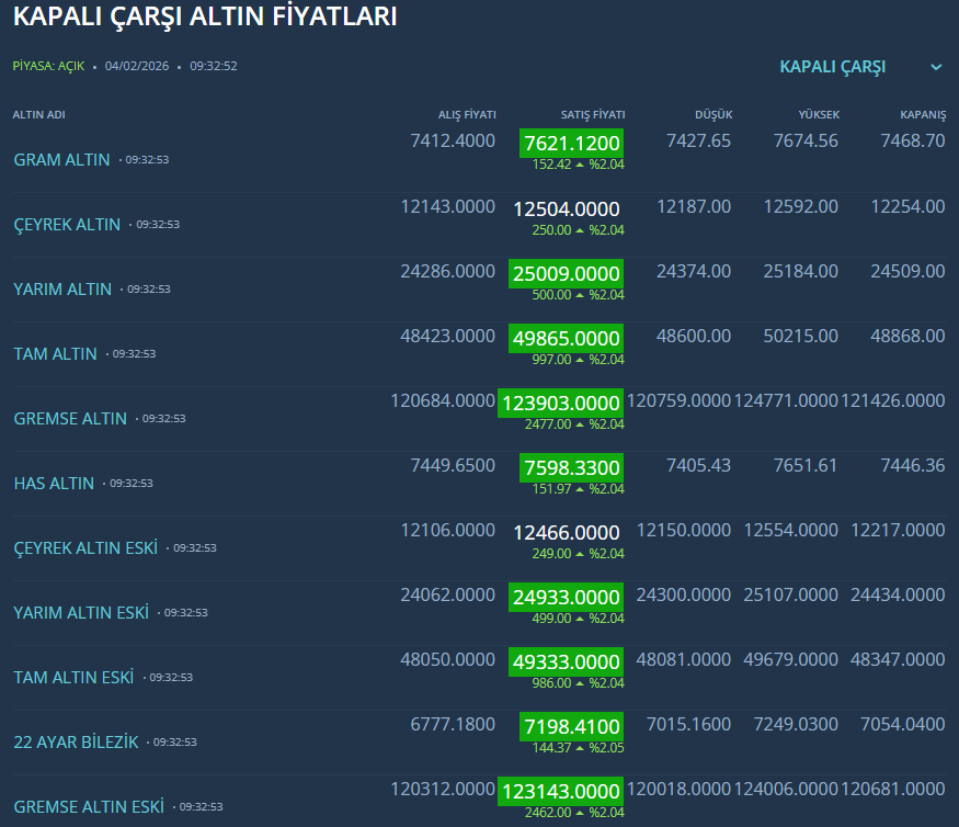 Kapalıçarşı altın fiyatları ile resmi altın fiyatları arasındaki fark devam ediyor. Kapalıçarşı'da gram altın 7 bin 621 liradan satılıyor. İşte Kapalıçarşı altın fiyatları...