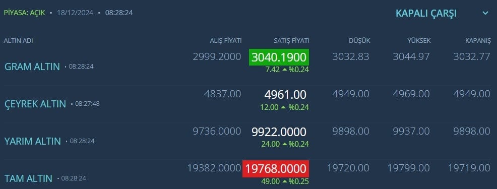 Kapalıçarşı altın fiyatları ve resmi altın fiyatları arasında değişim devam ediyor. Gram altın Kapalıçarşı'da 2 bin 40 liradan satılırken, resmi rakamlarda ise 2 bin 979 liradan satılıyor. Aradaki fark 61 TL düzeyinde. İşte Kapalıçarşı altın fiyatları...