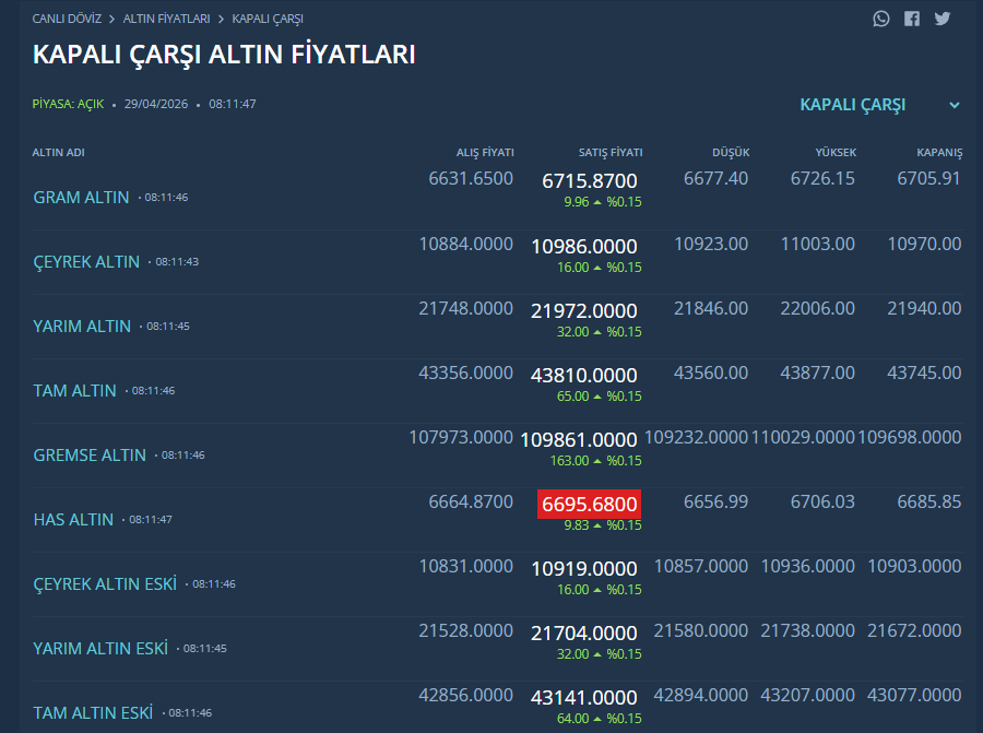 Kapalıçarşı altın fiyatları ile resmi altın fiyatları arasındaki fark devam ediyor. Gram altın Kapalıçarşı'da 6 bin 715 liradan satılıyor.