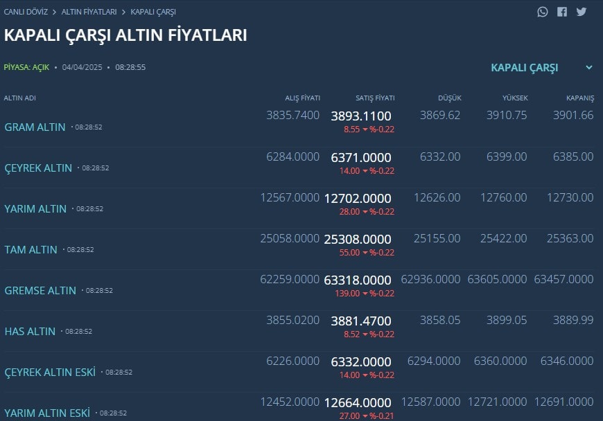 Kapalıçarşı alın fiyatları ile resmi altın fiyatları arasındaki fark devam ediyor. Gram altın Kapalıçarşı'da 3 bin 892 liradan satılırken, resmi rakamlarda ise 3 bin 798 liradan satılıyor. İşte Kapalıçarşı altın fiyatları...