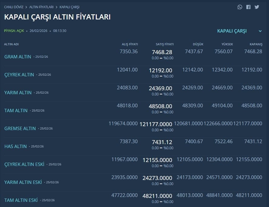 Kapalıçarşı altın fiyatları ile resmi altın fiyatları arasındaki fark devam ediyor. Gram altın Kapalıçarşı'da 7 bin 468 lirada bulunuyor. İşte Kapalıçarşı altın fiyatları...