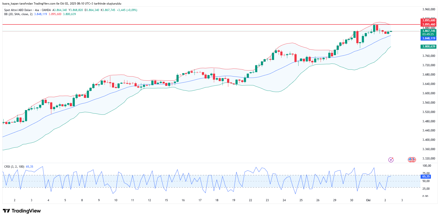 Dün 3 bin 895 dolara kadar yükselen ons altın tarihi zirvesini gördü. bugün ise bu zirvenin altında seyrediyor. Sabah 08.10'da 3 bin 867 dolarda bulunuyor.