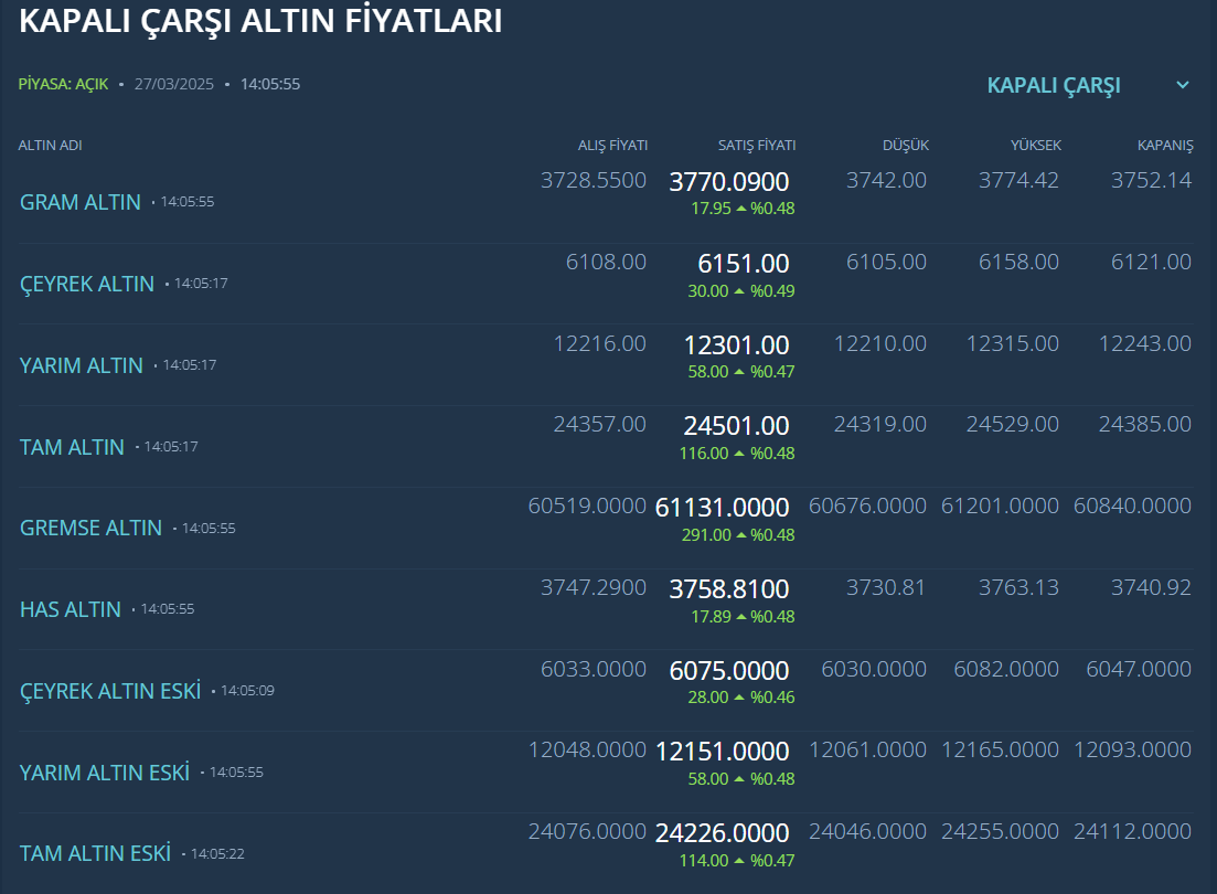 Bu yükseliş, Türkiye'deki altın fiyatlarını da etkiledi. Kapalıçarşı'da gram altın fiyatı 3.770,21 TL seviyesine yükseldi.