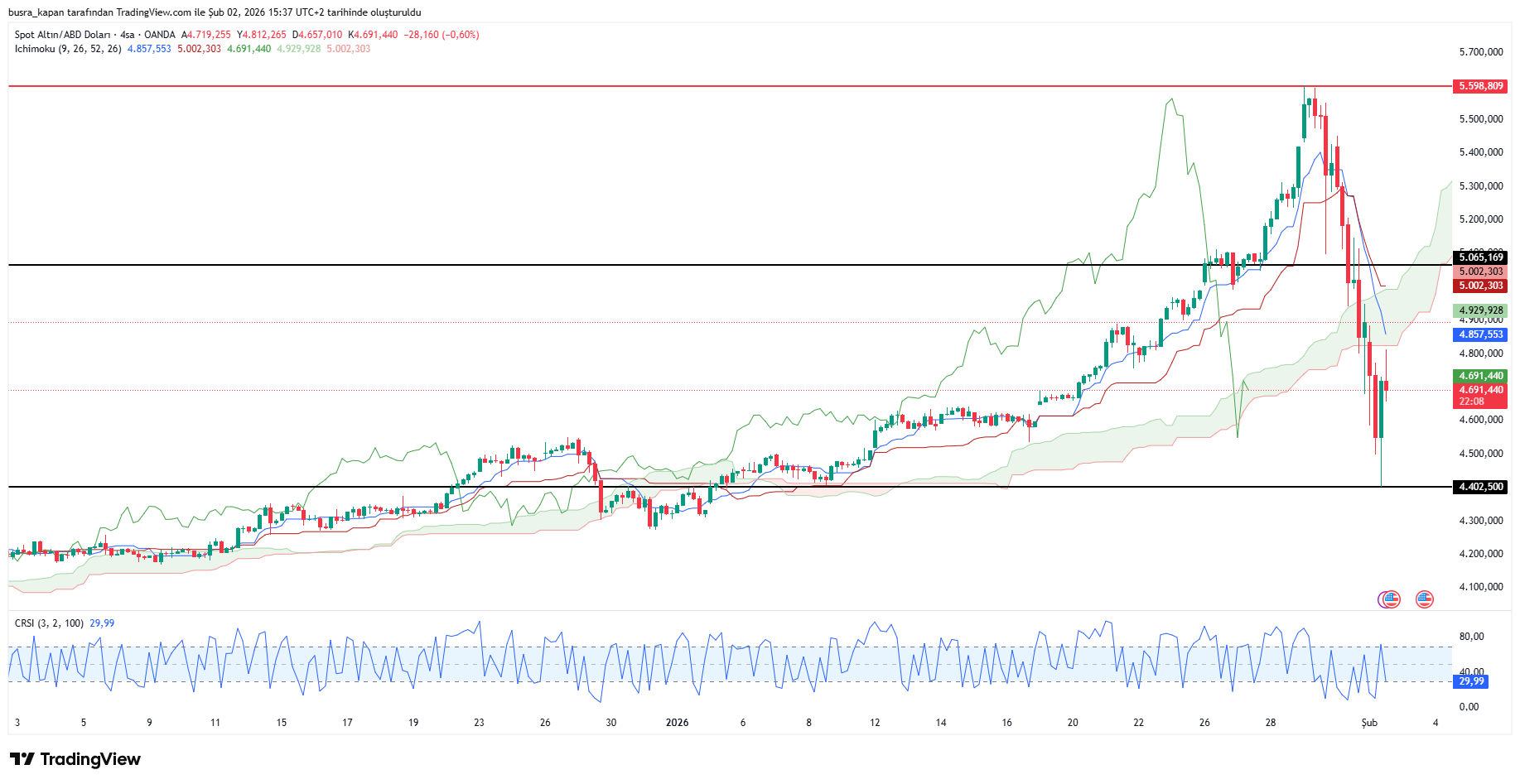 Ons altın perşembe günü 5 bin 598 dolara kadar yükselerek rekor tazeledikten sonra, 4 bin 402 dolara kadar keskin bir düşüş gösterdi. Ons altın perşembeden bu yana bin 986 dolar birden düştü. Ancak bugün 13.55 itibarıyla düşüşlerini dizginleyen ons altın yeniden toparlanarak 4 bin 758 dolara yükseldi.