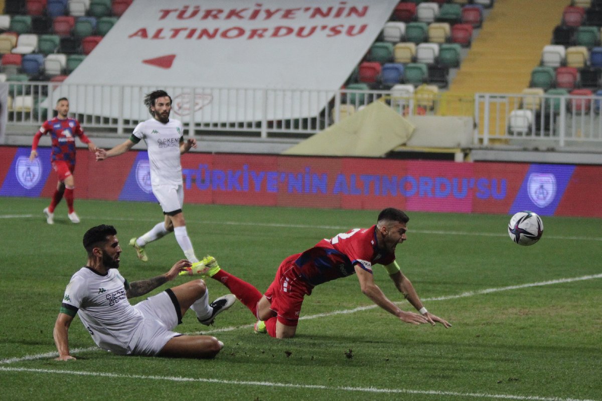 - 45' Sağ kanattan atak yapan Altınordu’da ceza sahasına yapılan ortaya yükselen Muzaffer, kaleci Korcan’ın müdahalesiyle yerde kaldı. Hakem penaltı kararı verdi.