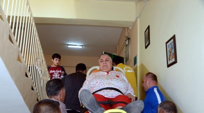 ADANA'da menisküs ameliyatı olan 52 yaşındaki Sevinç Boci, yürüyemediği için, tedavi gördüğü hastaneden ambulansla alınıp oyunu kullandı.