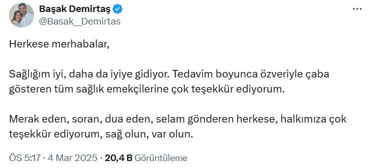 Başak Demirtaş, paylaşımında sağlığının iyi olduğunu belirterek şunları kaydetti: