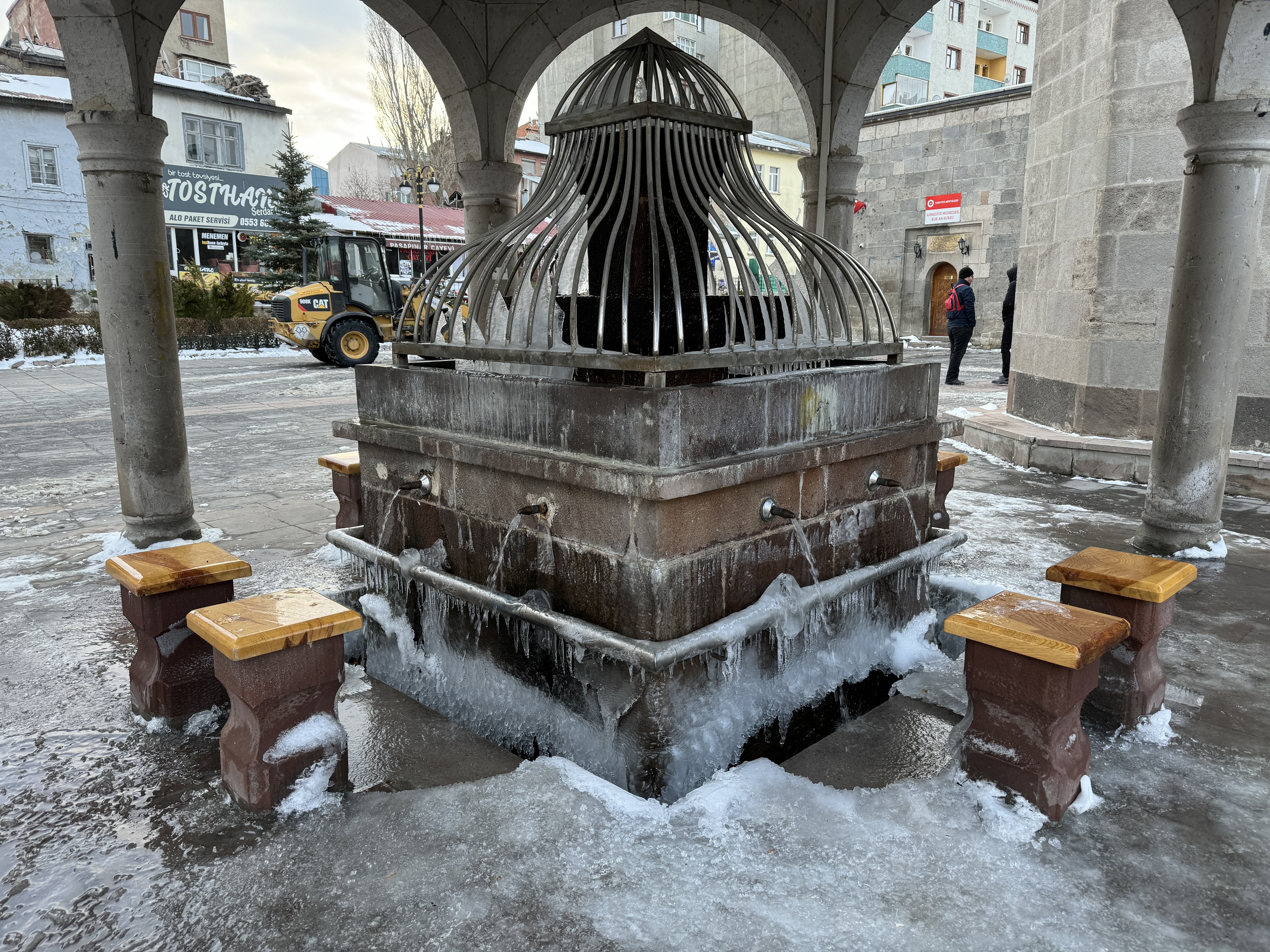 Erzurum'da, iki gündür etkili olan kar ve tipi yerini soğuk havaya bıraktı. Kentte, şadırvanlar dondu, çatılarda buz sarkıtları oluştu. Kaldırım ve yollarda buzlanmanın meydana geldiği kentte, belediye ekiplerinin kar temizleme çalışmaları sürüyor.