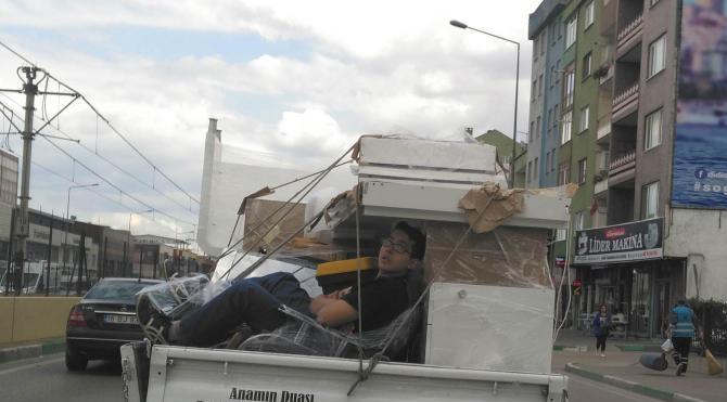Arkasında, 'Anamın duası, babamın gölgesi yeter' yazılı kamyonete yüklenen eşyaların üzerine oturan 17-18 yaşındaki bir kişinin adeta ölüme meydan okurcasına yaptığı yolcululuğu görenler, "İnsan hayatı bu kadar da basit olamaz. Birileri, hem tehlikeli yolculuk yaptırıyor, hem de o aracın arkasına, 'Annemin duası, babamın gölgesi yeter" diye yazıyor. Ve o araç şehir içersinde yük taşıyor" diye konuştu.