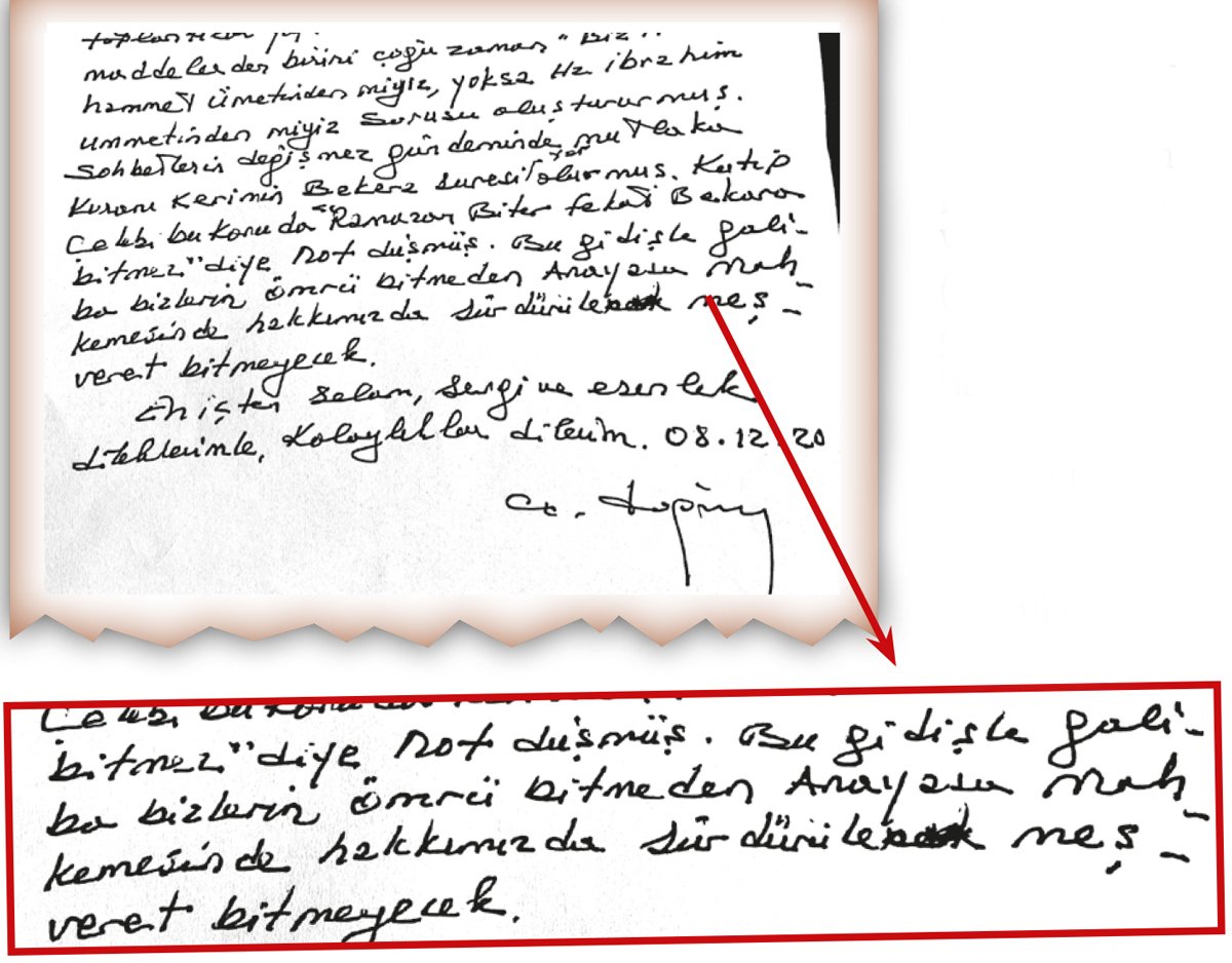 “... Son olarak Anayasa Mahkemesi’nde sürdürülen davaya ilişkin çok önce yazdığım açık mektuba bazı ilaveler yapmaktan kendimi alamayacağım. Davanın sonuçlandırılmasındaki uzama, kuruma yeni katılanların oryantasyonu/ikna gayretinden mi? Yoksa da yukarıda alıntısını yaptığım Yargıtay İlamı’nda söz konusu edilen olmayan delillerin nafile araştırmasından mı kaynaklanıyor?