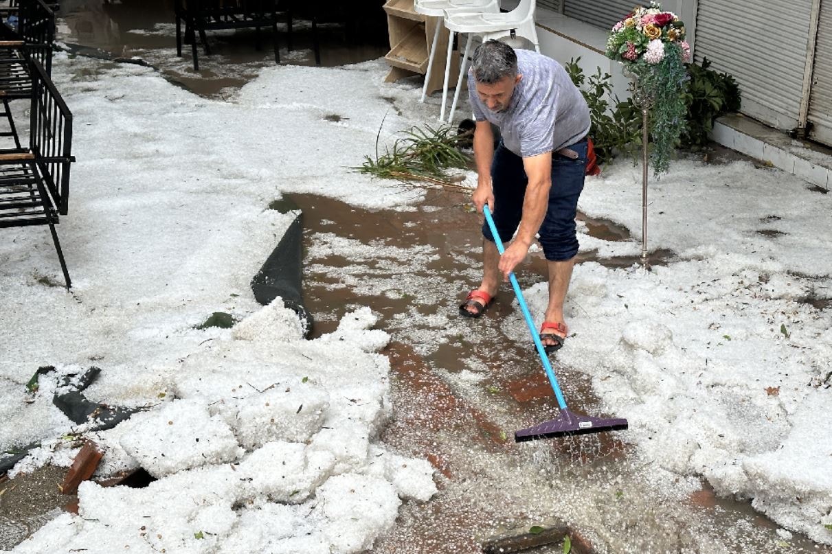 Vatandaşlar apartmanların ve iş yerlerinin saçak altlarına sığınırken, esnaf ise fırçalarla dükkanlarının önünü temizlemeye çalıştı. Dolu yağışı, bazı bölgelerde foseptik taşmalarına neden oldu, apartman girişlerini su altında bıraktı.