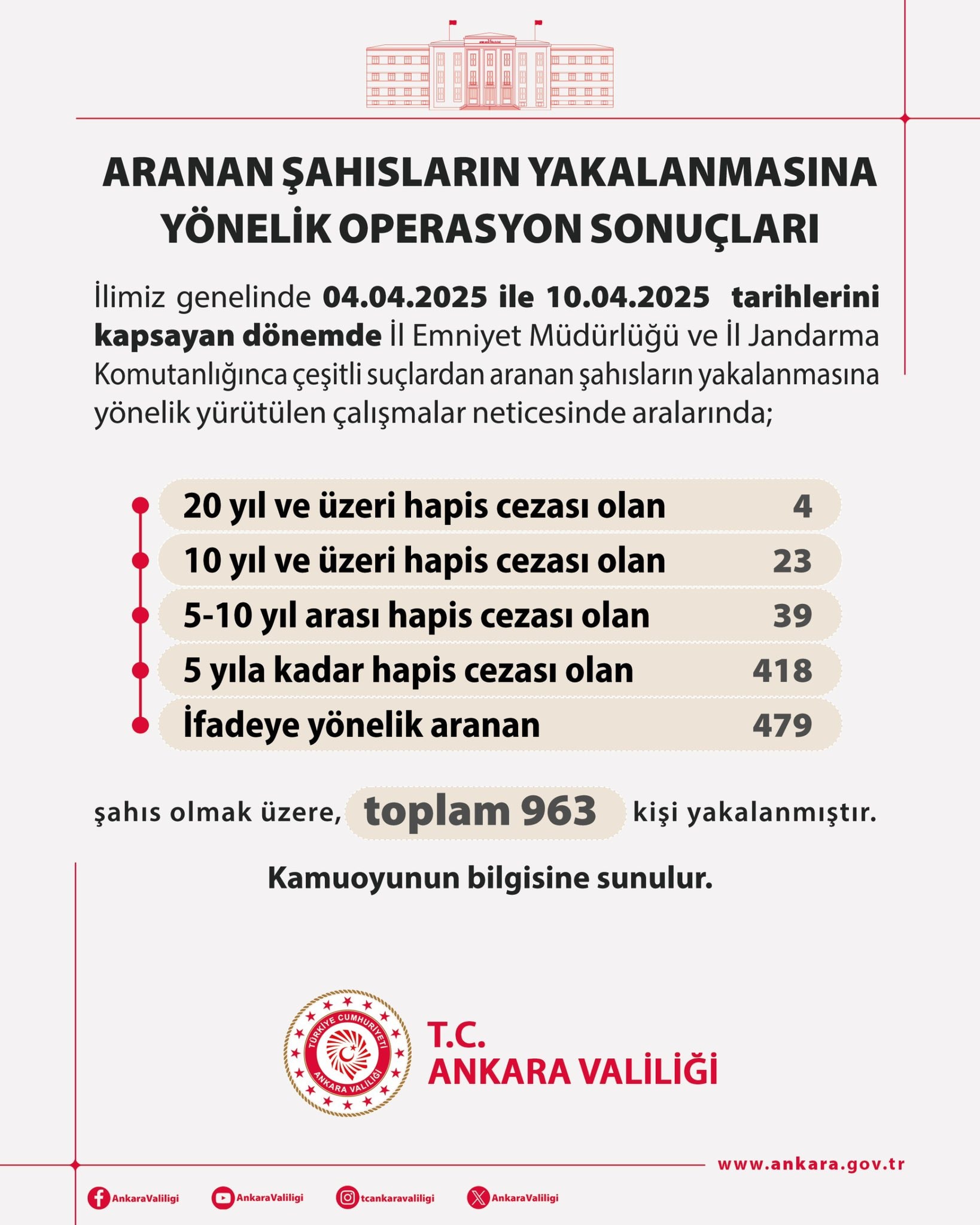 Ankara Valiliği'nin "Aranan şahısların yakalanmasına yönelik operasyon sonuçları" başlıklı duyurusunda, 4-10 Nisan tarihlerinde aranan şüphelilerin yakalanmasına yönelik emniyet ve jandarma ekiplerince çalışma yürütüldüğü kaydedildi.