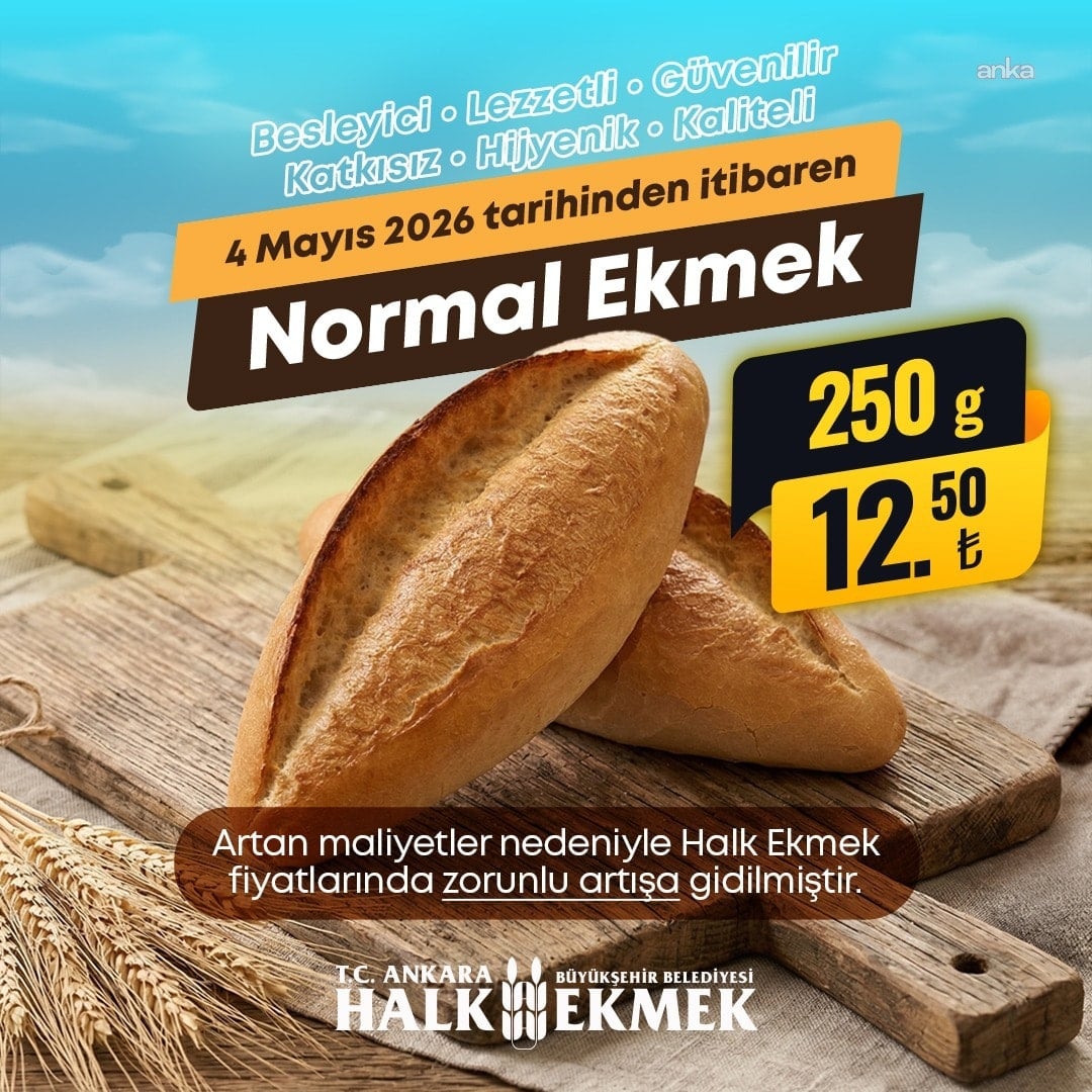 ABB Halk Ekmek'in sosyal medya hesabından yapılan paylaşımda "4 Mayıs 2026 Pazartesi gününden itibaren 250 gramlık normal ekmeğimiz tüm Halk Ekmek satış noktalarında 12,50 TL'den satılacaktır. Kamuoyuna saygıyla duyurulur" ifadeleri kullanıldı.