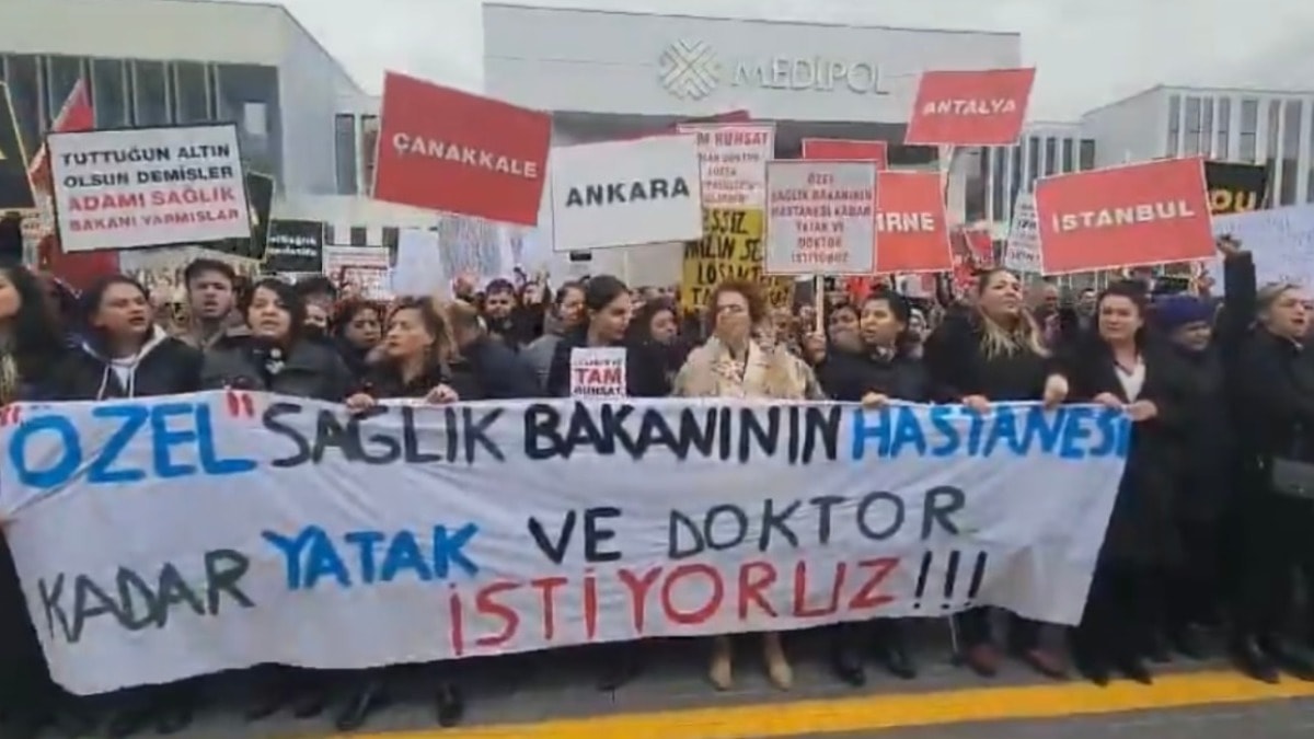 Sağlık Bakanı Fahrettin Koca’nın kurucusu olduğu Tesa Vakfına ait Medipol Hastanesi önündeki eylemde "Lösante’ye tam ruhsat" sloganları atıldı ve "Sağlık bakanının hastanesi kadar yatak ve doktor istiyoruz’’ yazılı pankartlar açıldı.