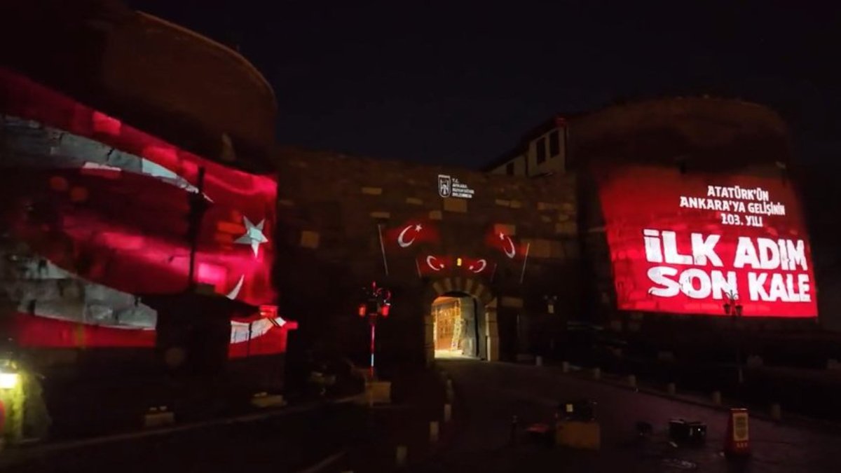 Atatürk’ün Ankara’ya gelişinin 103. Yılı kentte çeşitli etkinliklerle kutlanıyor. Kutlamalar kapsamında Ankara Kalesi’nin bir bölümüne Türk bayrağı görseli yansıtılırken başka bir bölümüne ise ‘İlk adım son kale’ yazıldı.
