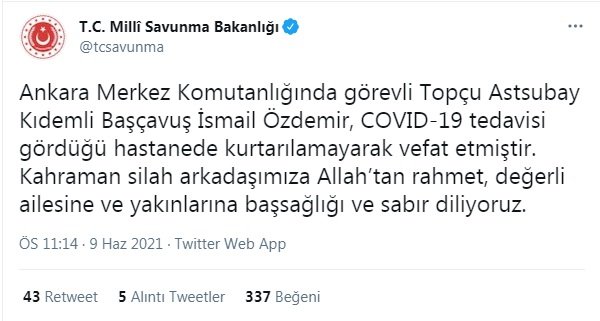 * Ankara Merkez Komutanlığında görevli Topçu Astsubay Kıdemli Başçavuş İsmail Özdemir, COVID-19 tedavisi gördüğü hastanede kurtarılamayarak vefat etmiştir. Kahraman silah arkadaşımıza Allah’tan rahmet, değerli ailesine ve yakınlarına başsağlığı ve sabır diliyoruz.